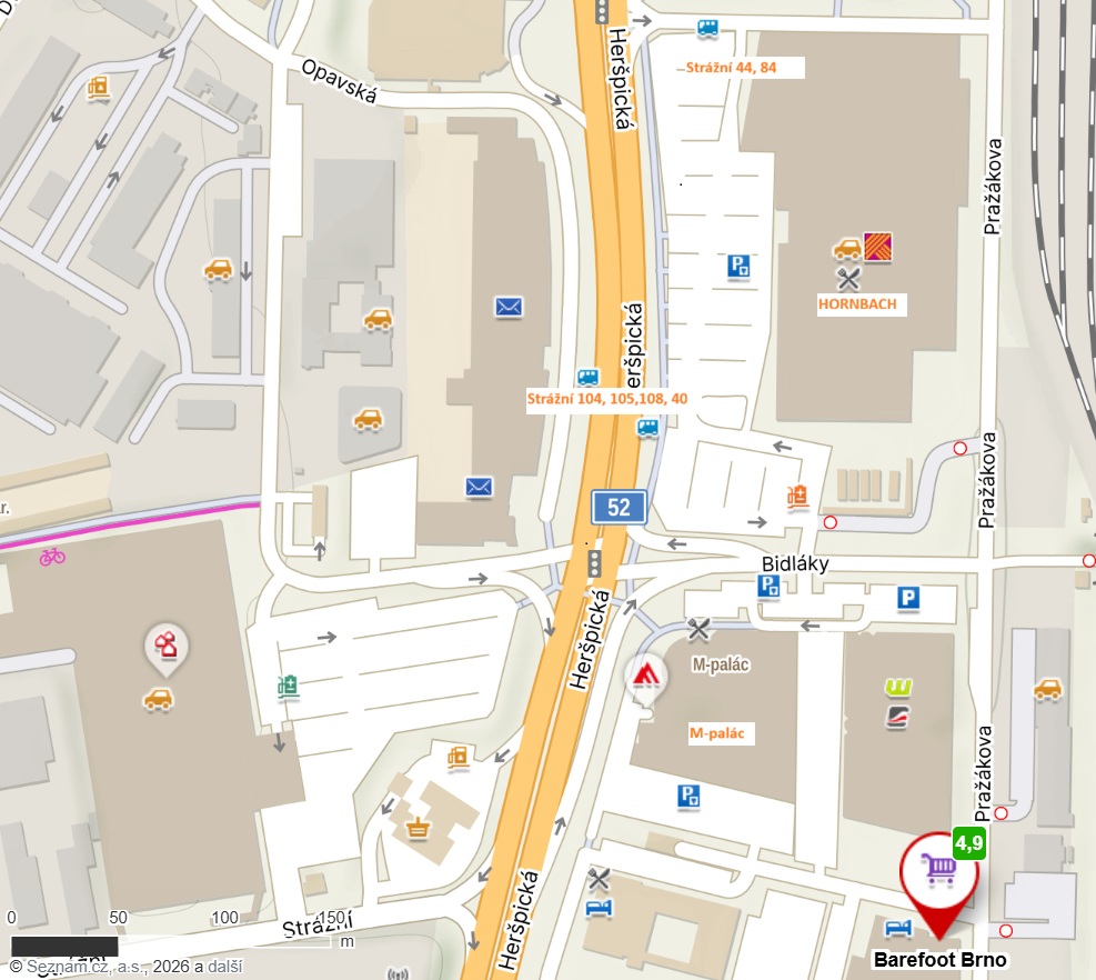 Autobus č. 44, 84 - zastávka Strážní, projít kolem Hornbachu a M-Paláce (cca 550m)